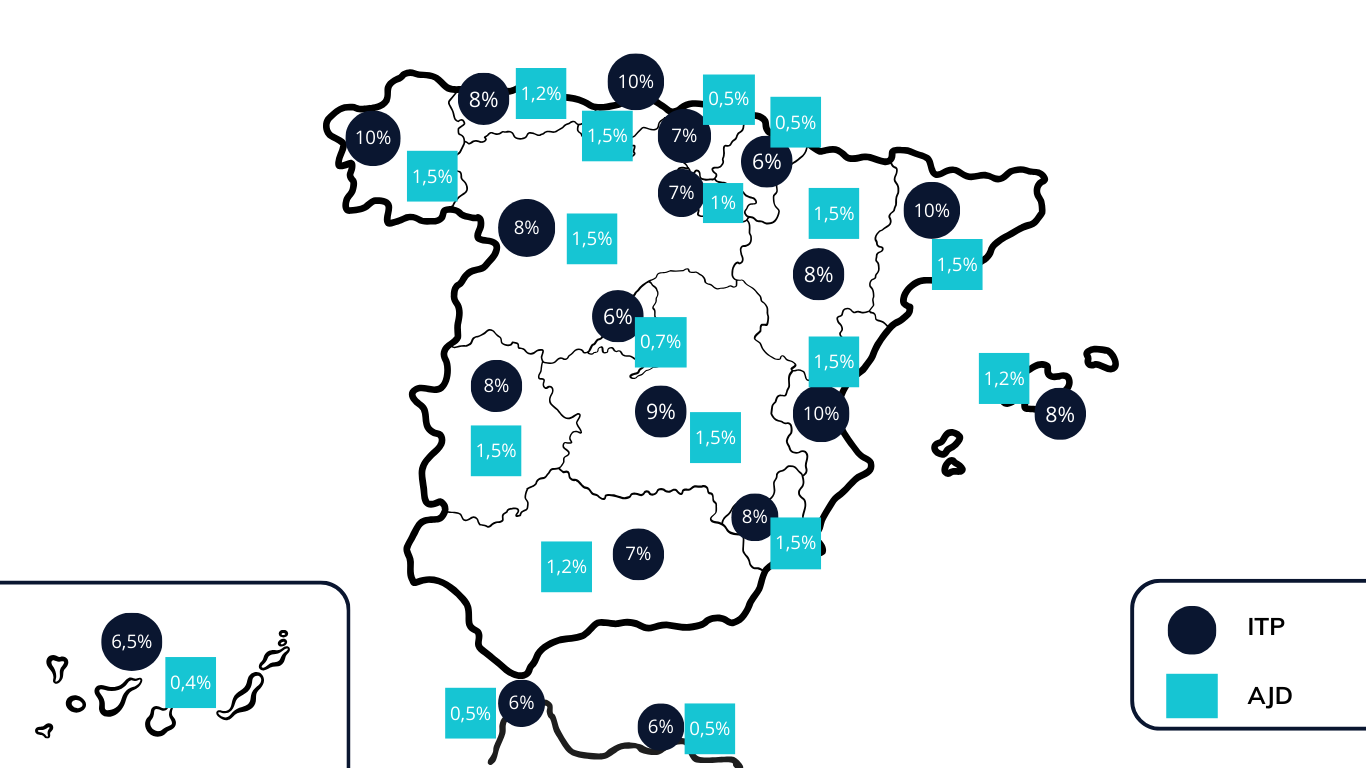 Comparación de impuestos ITP y AJD en España por Comunidades Autónomas